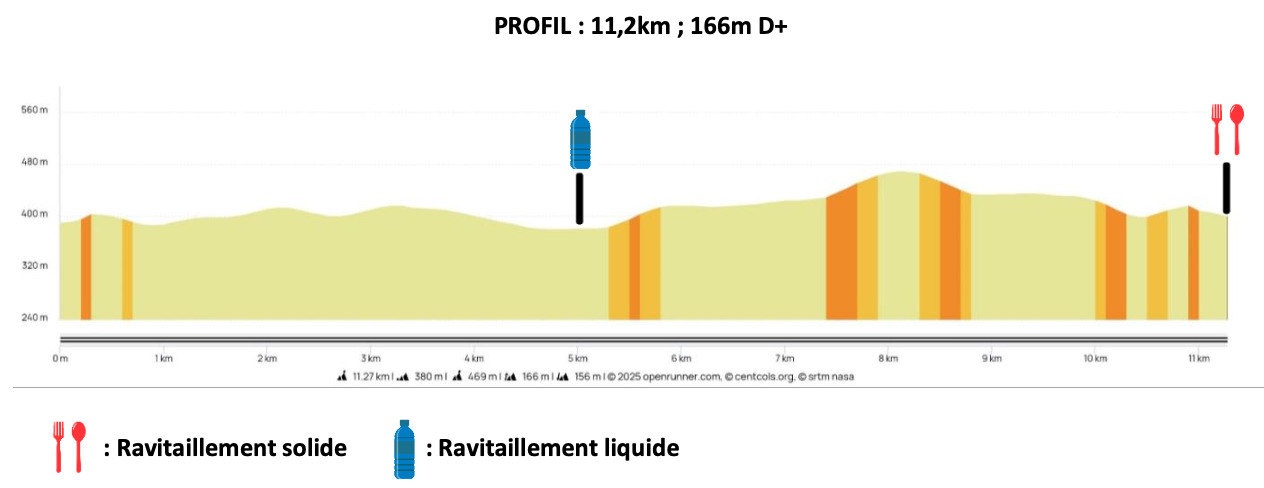 Ce parcours de 10 km est un excellent tremplin pour se préparer aux 20 et 32km. Le parcours est légèrement vallonné. L’altitude varie entre 500 et 700 mètres. Vous disposez d’un ravitaillement en eau à mi-parcours. Le tracés est identique à celui de 2025. Voir modèle des flèches en bas de page.
