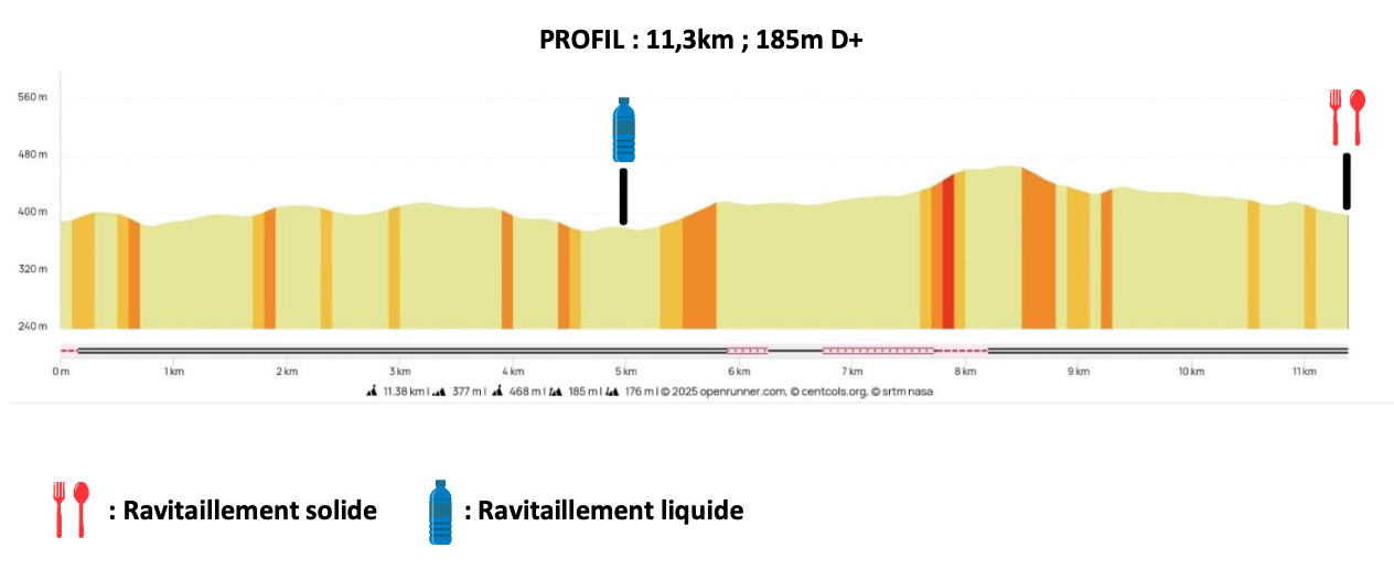 Ce Canitrail de 11km présente un dénivelé de 221 mètres.  Le modèle des flèches est le même que la 10km.
